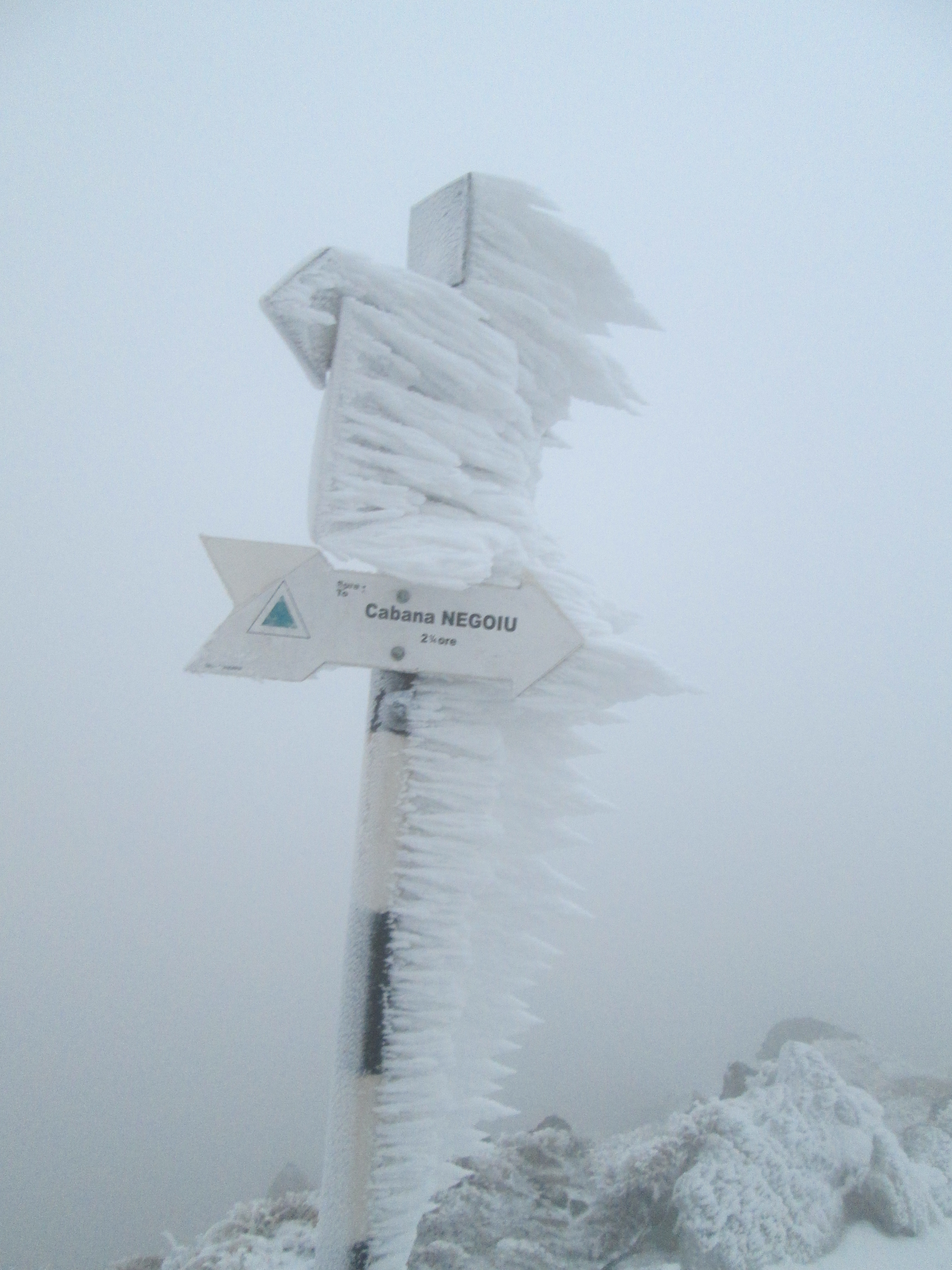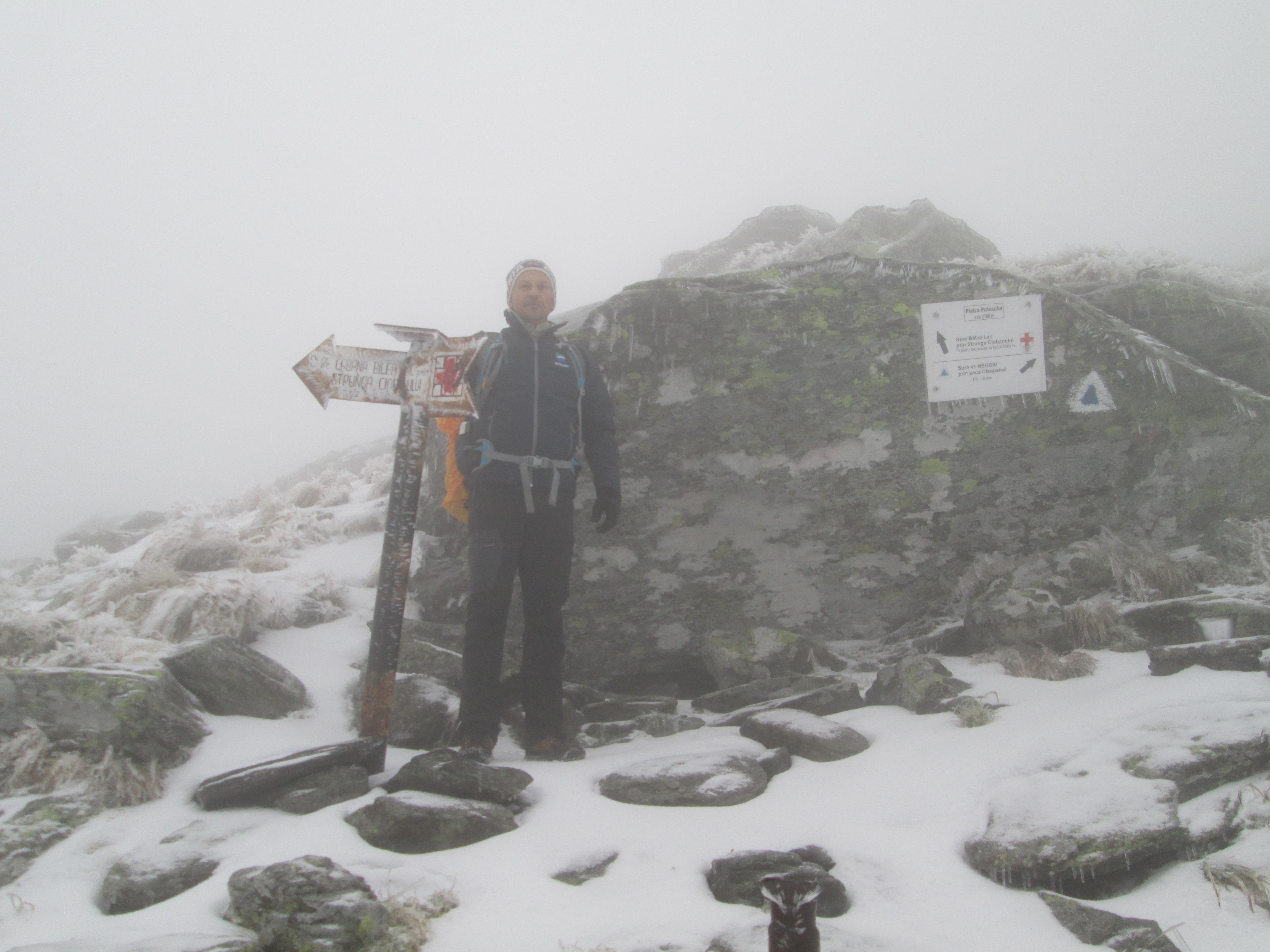 Traseul a durat mai mult cu cateva ore decat in conditii de vara, pe Negoiu am ajuns inainte de lasarea intunericului, tocmai la timp cat sa mai avem un pic de lumina sa trecem de Cleopatra la coborare si sa iesim din ceata si zapada pana s-a facut intuneric de tot. Ghetele alunecau pe stancile ude si nu o data am dat cu fundul de pamant la coborare, oricat de atent incercam sa pasesc.