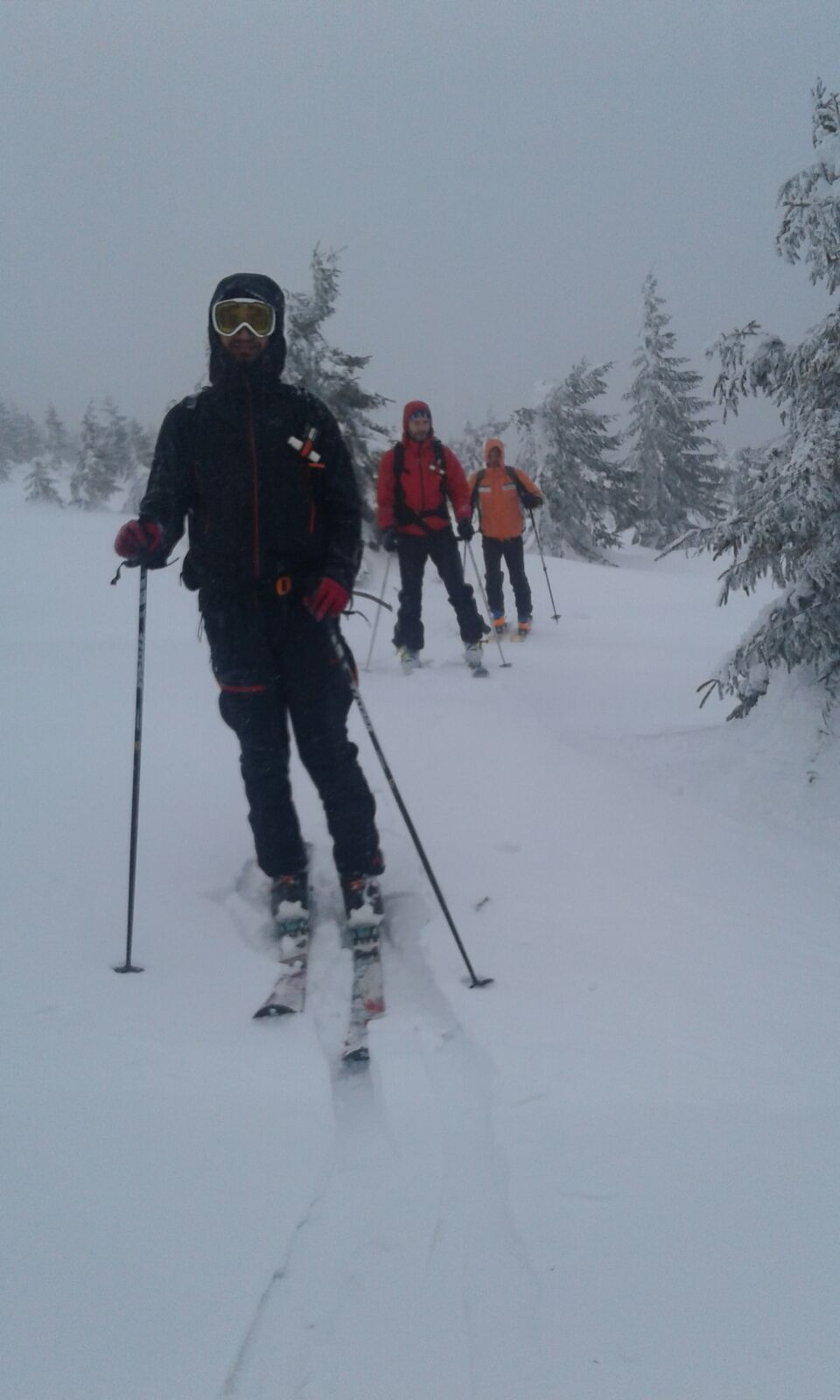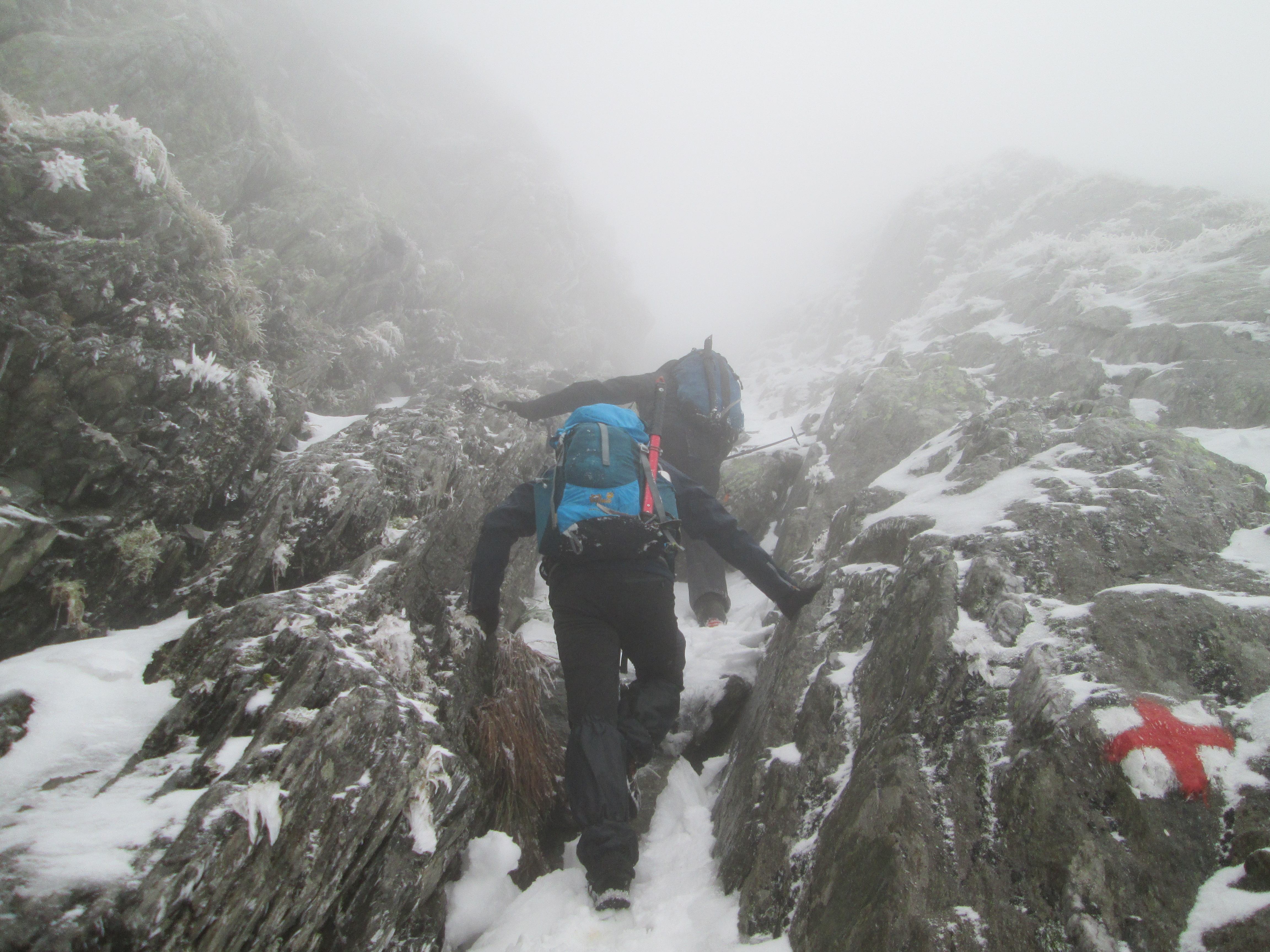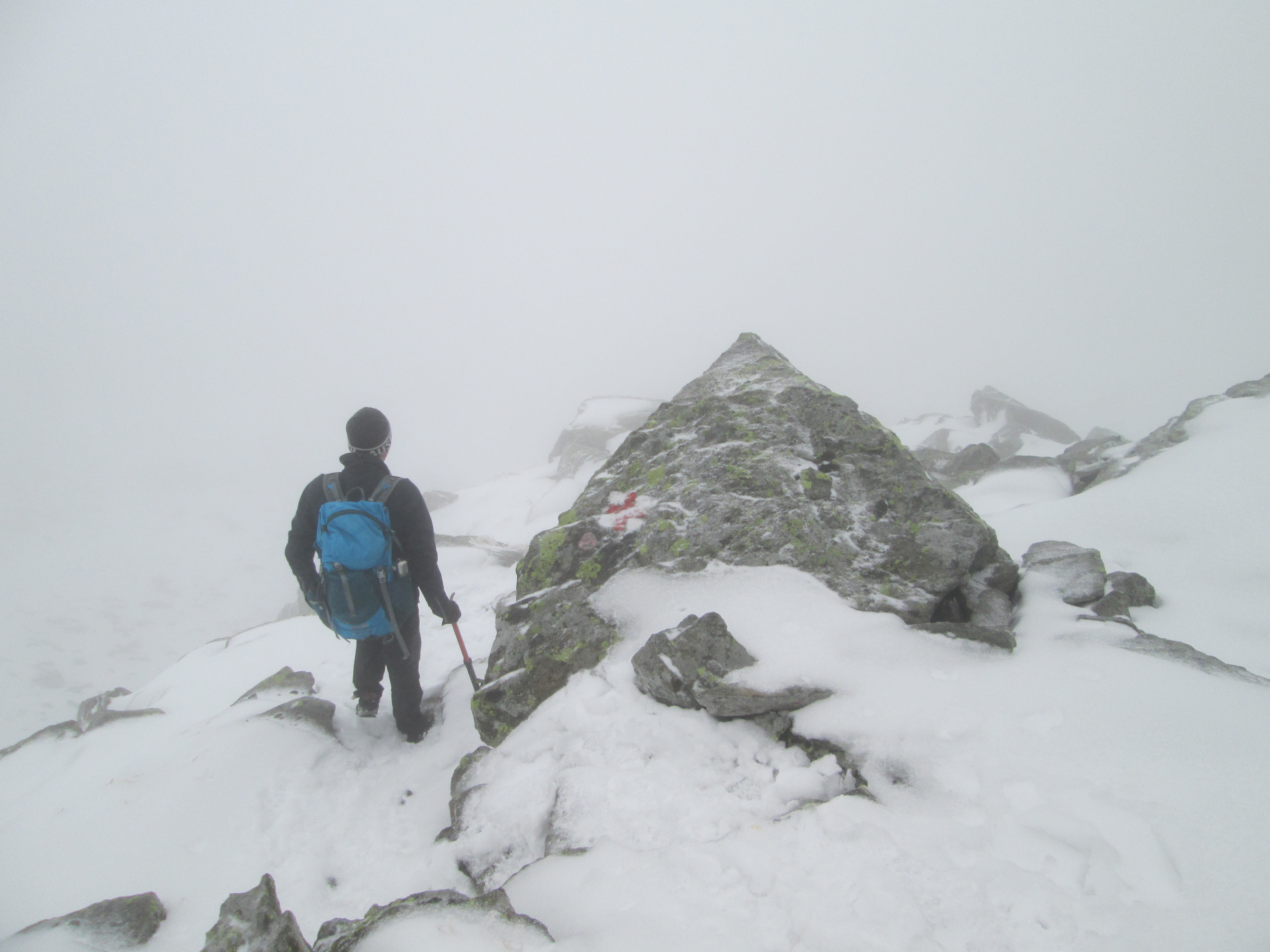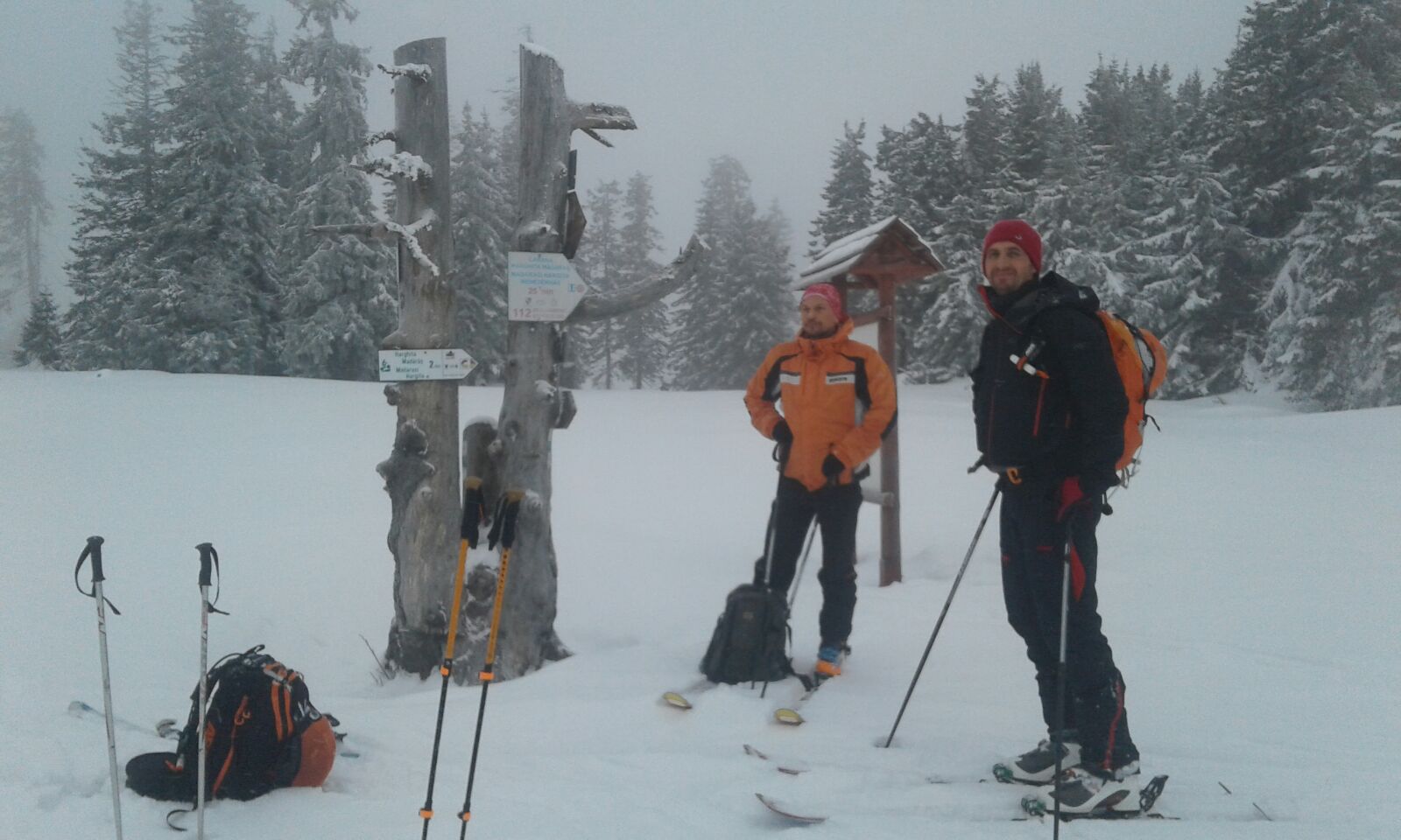 Insa pe masura ce urcam zapada era tot mai prezenta. In scurt timp ghetele de vara s-au udat, dar daca am pornit intr-o directie nu ne-am mai uitat inapoi. 🙂 Am decis ca vom intra pe traseu, chiar daca nu aveam coltari, aveam cate un piolet asa ca ne-am pus pe treaba fara sa vedem prea multe in jur din cauza cetii foarte dese.
