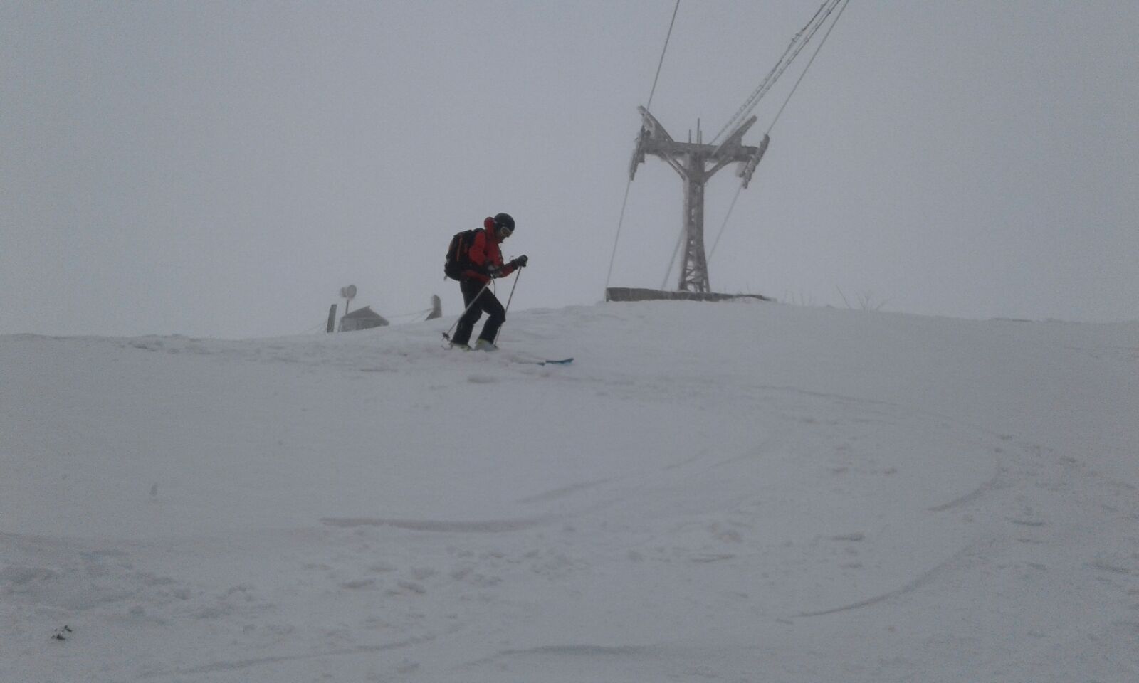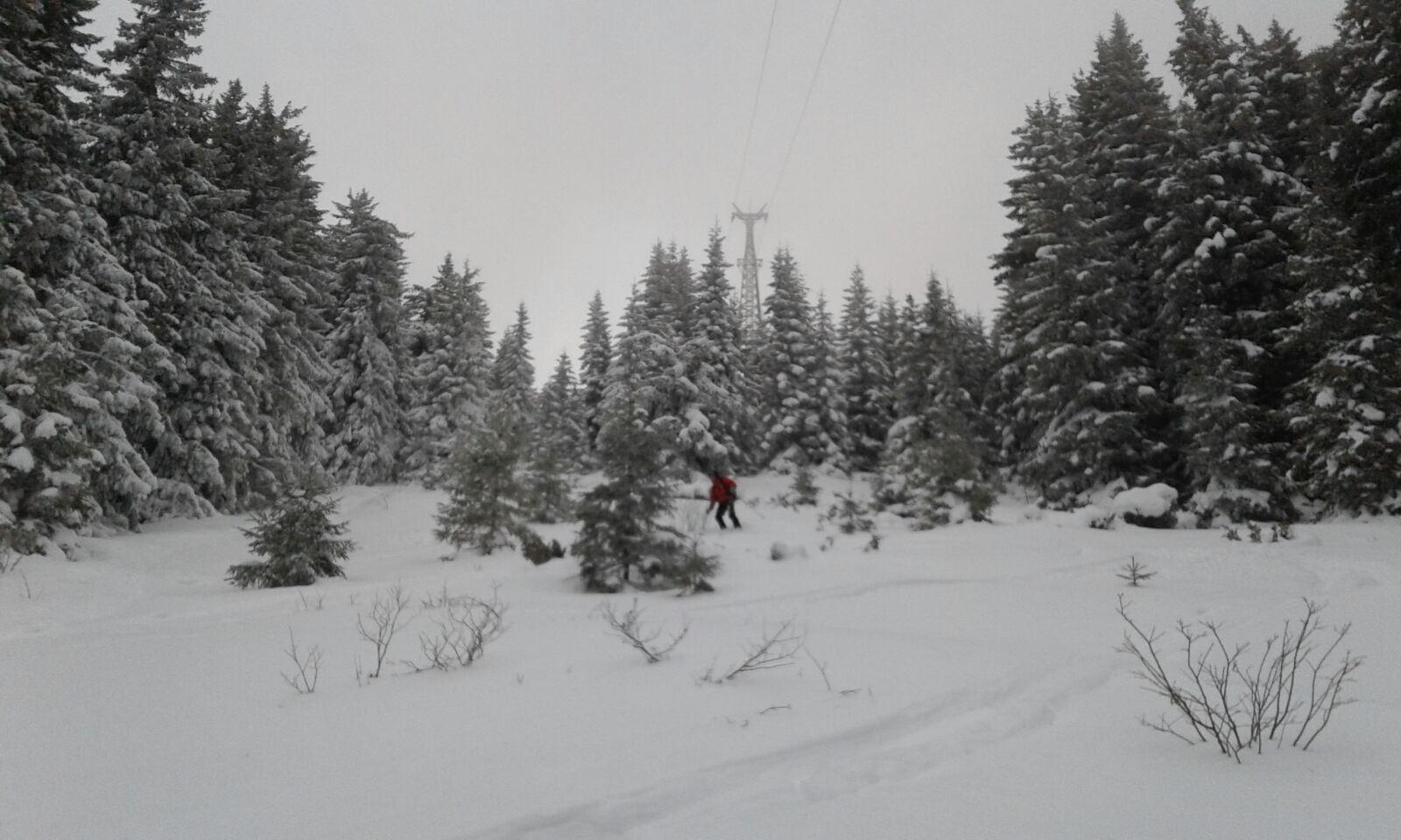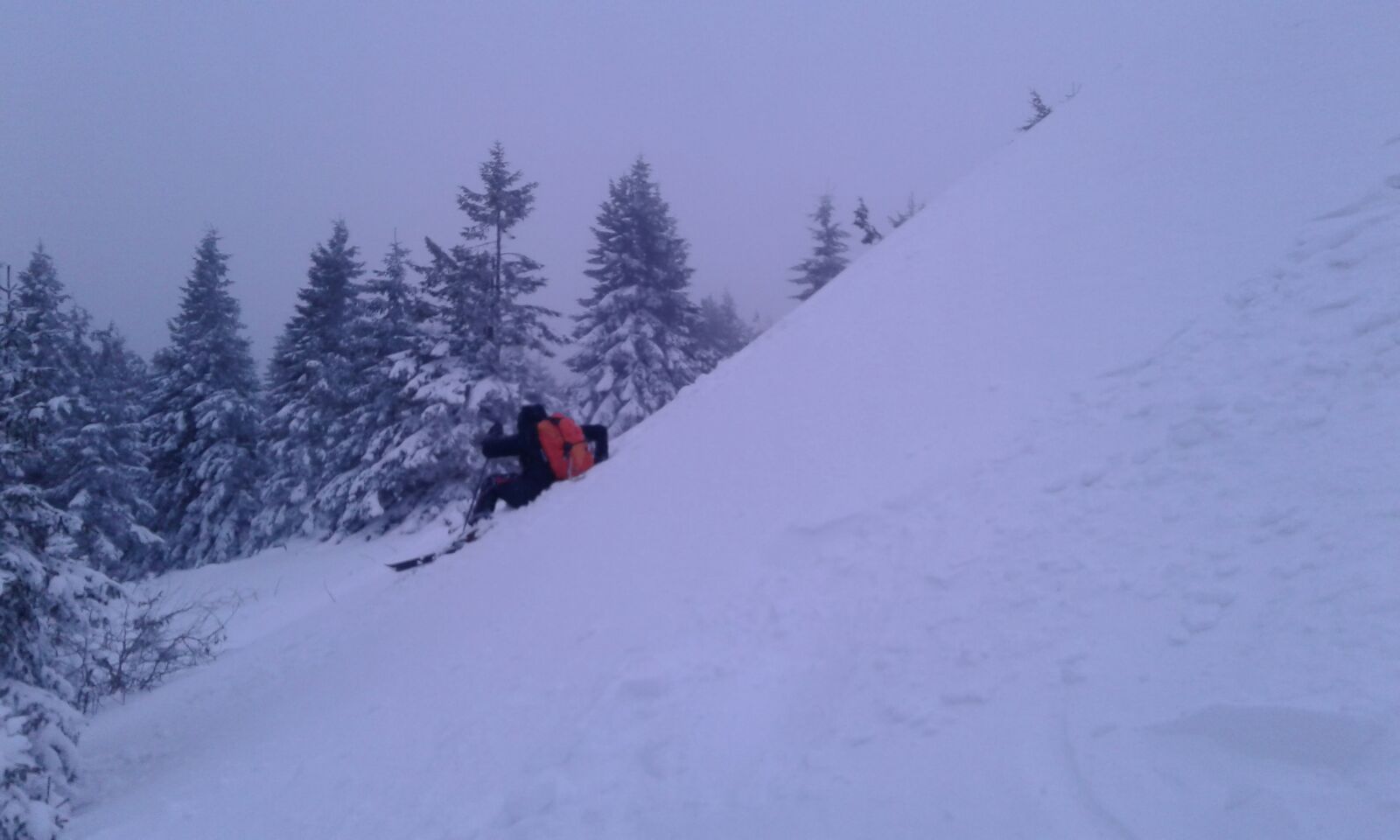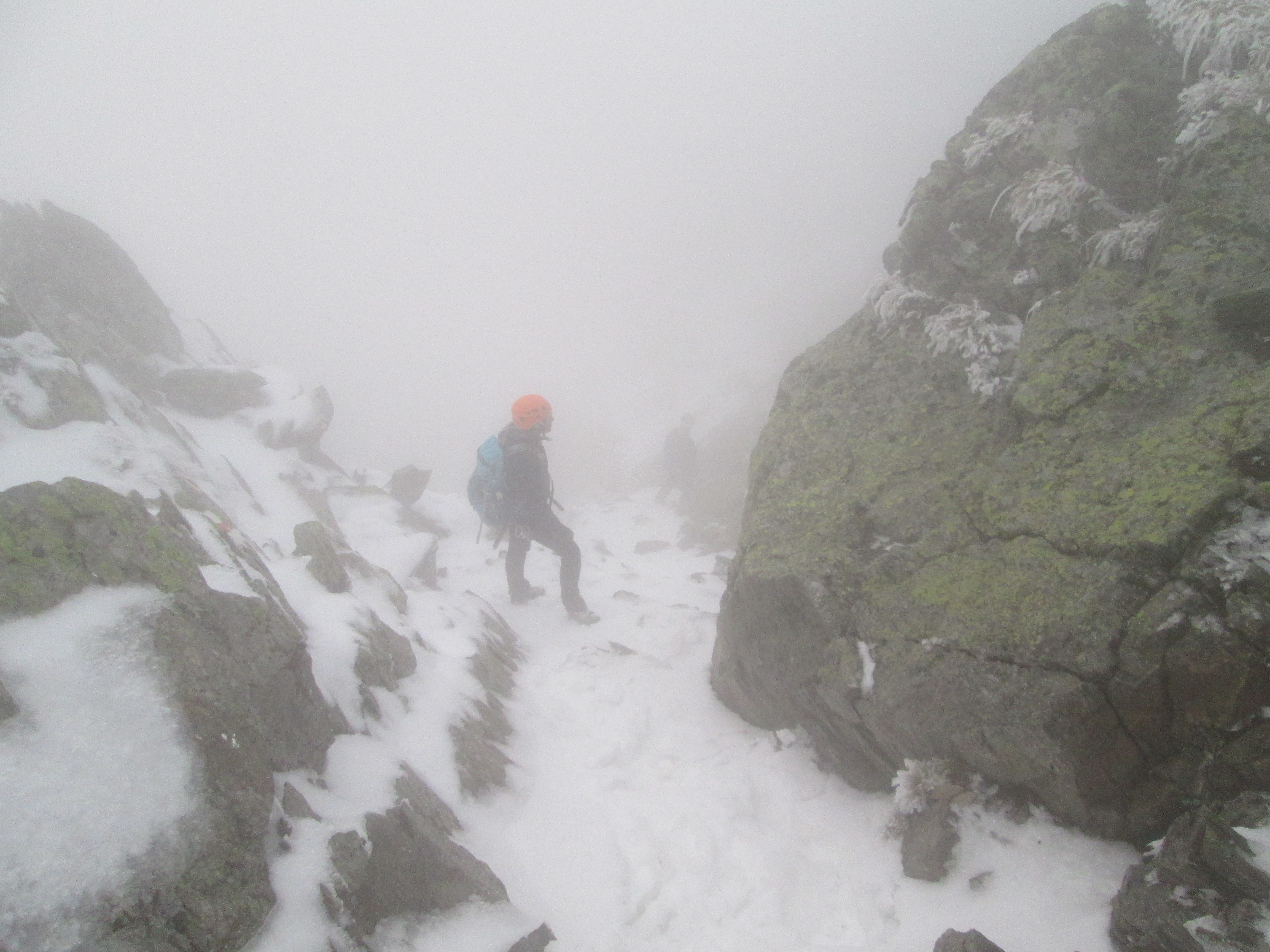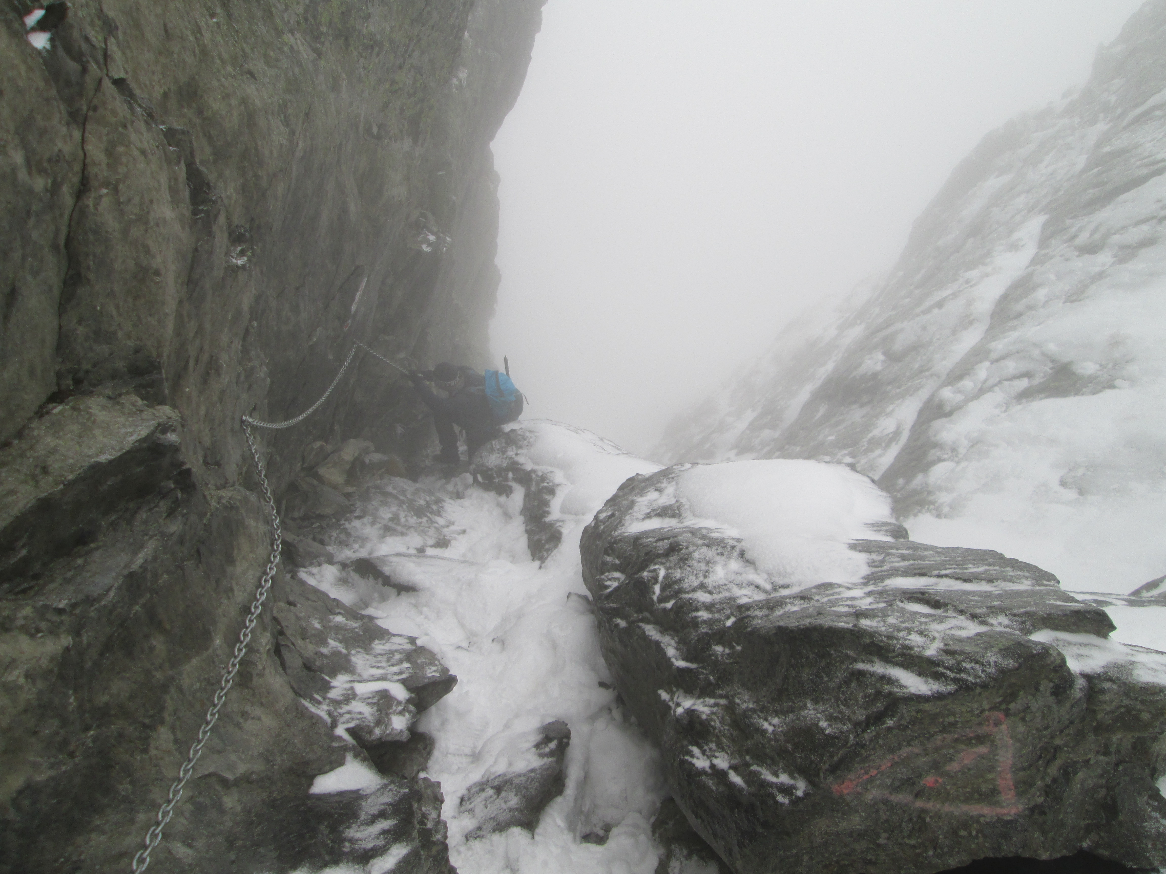 Insa pe masura ce urcam zapada era tot mai prezenta. In scurt timp ghetele de vara s-au udat, dar daca am pornit intr-o directie nu ne-am mai uitat inapoi. 🙂 Am decis ca vom intra pe traseu, chiar daca nu aveam coltari, aveam cate un piolet asa ca ne-am pus pe treaba fara sa vedem prea multe in jur din cauza cetii foarte dese.