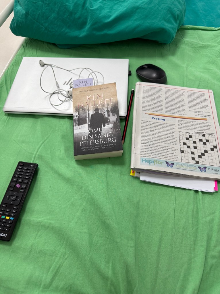 In salon, acelasi aranjament cu 3 paturi, l-am putut alege pe cel de la fereastra, pot sta cu spatele la tot restul universului salonului cand vreau si asta e o usurare. Unul dintre camarazii de suferinta e un veteran al bolilor: cancer la colon vindecat acum 12 ani dupa lupte si operatii grele, accident de masina grav acum 7 ani si acum mielom, cancer la maduva osoasa. Celalalt e mai agitat, tot iese pe usa salonului si povesteste, printre altele, despre un prieten care evadeaza de la psihiatrie in costum de Napoleon. Oare sa ma pun la somn noaptea? 😂 Ce ar mai fi de zis …musai sa-mi urc varful si sa scap de aici…