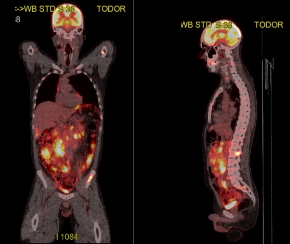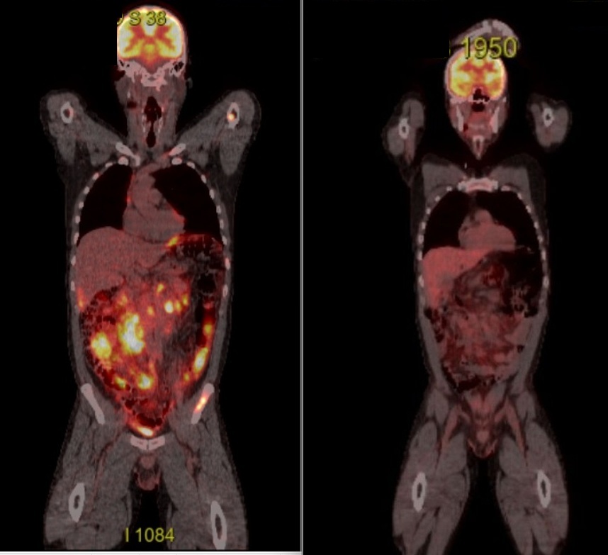 PET CT-ul folosește o substanta, o formă de glucoza marcata radioactiv, iar celulele care consuma multa glucoza apar mai luminoase („stralucesc”) pe imagine. Este cazul celulelor tumorale, mari consumatoare de glucoza, asfel incat, cu exceptia capului, unde creierul are activitate intensa metabolica si in imprejurari normale, sunt invadat de limfom, scor Deauville maxim posibil, 5 din 5, mai bine nu ma gandesc la asta… ☹️