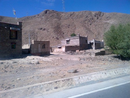 Pustietatea a pus tot mai mult stapanire pe intreg peisajul, din loc in loc mai aparea cate un sat izolat. Casele sunt de fapt niste constructii de forma cubica in care sunt plantate geamuri. In jurul satelor se mai vede cate o pata de ceva verde, un fel de iarba care nu am inteles prea bine cum se numeste, doar ca e buna si la fabricarea berii. Berea Lhasa, din care am tot baut de cateva zile. 🙂