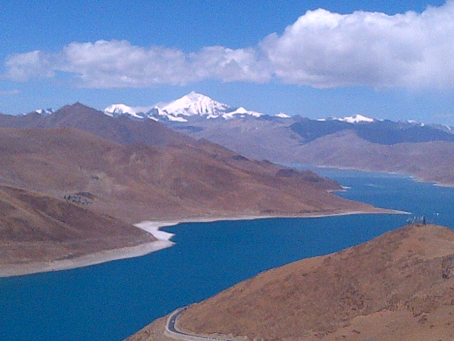 Curbele sunt tot mai dese si mai stranse, transfagarasanul e minuscul pe langa ce-i aici. Brusc si-a facut aparitia un lac imens, lacul Yamdrok. De un albastru superb, se intinde cat vezi cu ochii pana departe, unde rasare din el un munte alb…ghetarul Karola. Yamdrok e un lac sfant, localnicii nu se apropie de el. In schimb chinezii pescuiesc in lac si probabil vand pesti si tibetanilor!
